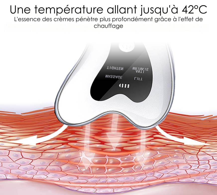 Le Gua Sha Électrique 4 Modes en 1 utilise une température chauffante d'environ 42°C pour optimiser ses bienfaits sur votre peau. La chaleur douce aide à dilater les vaisseaux sanguins, améliorant ainsi la circulation sanguine et permettant une meilleure absorption des produits de soin appliqués.